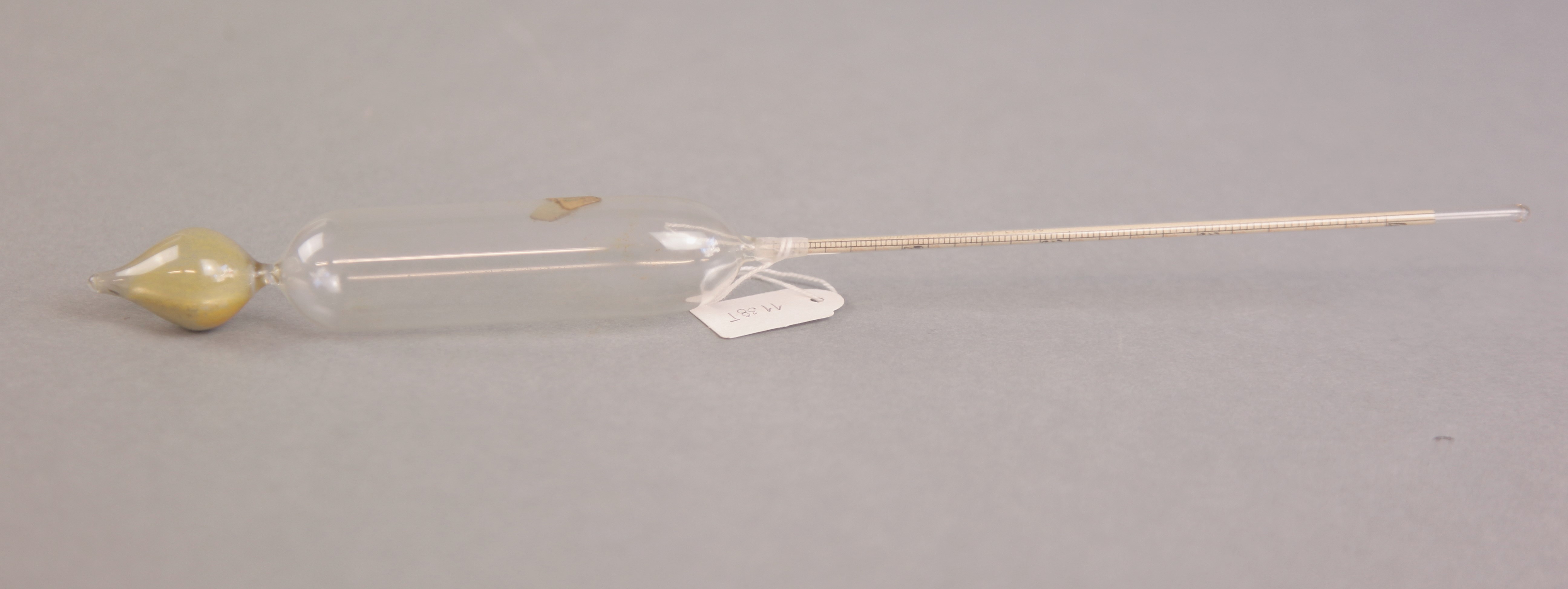 | Descrição: | Composto por um tubo de vidro perfeitamente cilíndrico apresentando na parte inferior uma ampola, e por baixo desta, outra mais pequena terminada em ponta, com mercúrio para fixar o centro de gravidade por baixo do centro de impulsão e conservar a haste vertical quando flutua. |
