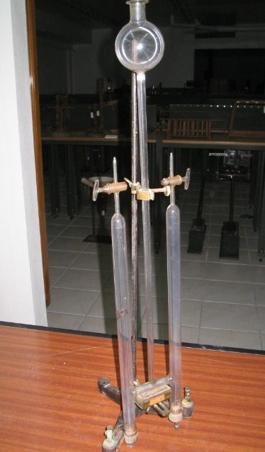 | Finalidade: | Utilizado para o estudo da eletrólise, decompondo a água em hidrogênio, pela ação da eletricidade, usando uma corrente contínua. Em conjunto com outro voltâmetro de de elétrodos de cravão e um com elétrodos de platina realizavam a experiência de demonstração da segunda lei de Faraday. |