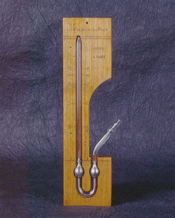| Descrição: | Composto por tubo cilíndrico em U, fechado numa das extremidades, e parcialmente cheio de mercúrio de modo a que uma certa massa de ar fique isolada. A extremidade livre comunica com o exterior, e pode ser ligada através de uma torneira ao recipiente que encerra o gás ou vapor cuja pressão se quer medir. O tubo está fixo num suporte de madeira que tem gravado a escala de pressão, geralmente em atmosferas. A pressão exercida sobre a coluna de mercúrio comprime o ar encerrado, cujo volume diminui na mesma proporção em que aumenta a pressão sobre ele exercida (lei de Boyle-Mariotte). |